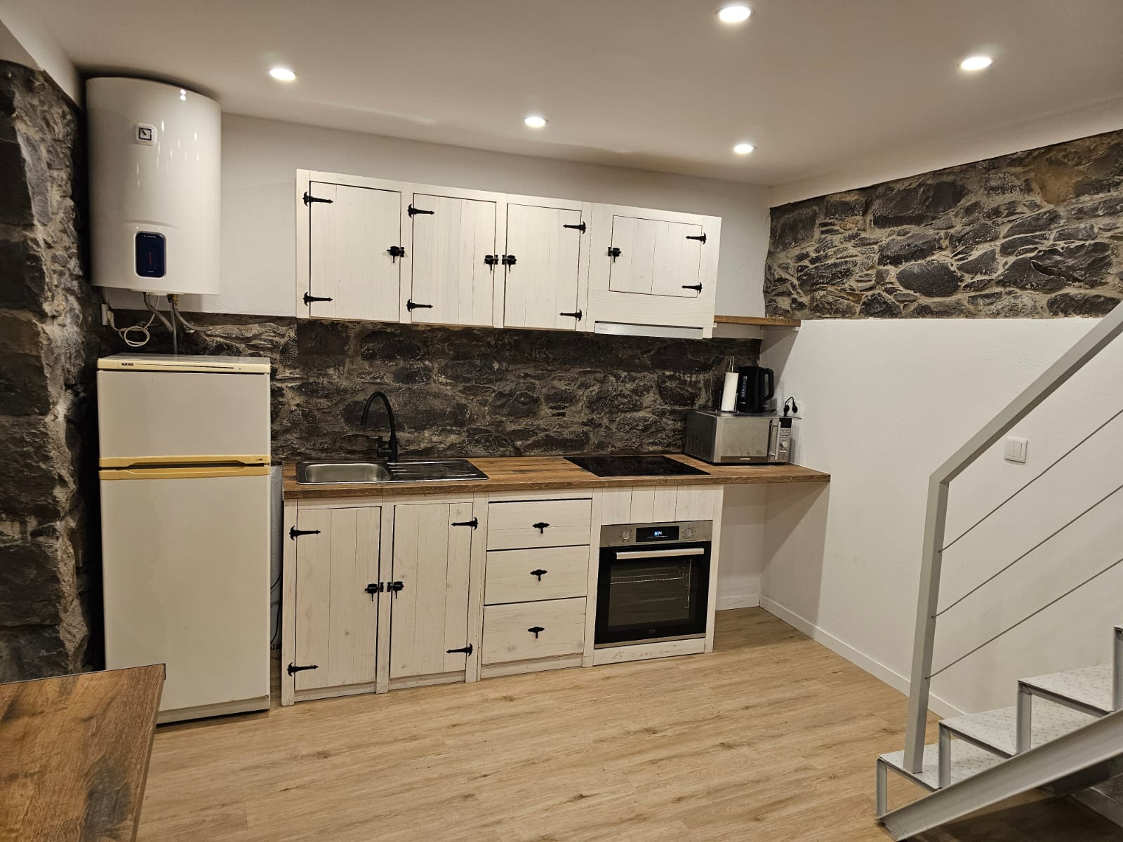 A cozinha, embora pequena, é acolhedora e funcional, perfeita para preparar refeições num ambiente encantador. Decorada com móveis rústicos em madeira, oferece um toque tradicional que combina harmoniosamente com o ambiente natural da quinta. Está equipada com um forno moderno, placa de indução e um frigorífico compacto, garantindo praticidade sem perder o charme campestre. É um espaço pensado para inspirar momentos simples e saborosos no coração da natureza.